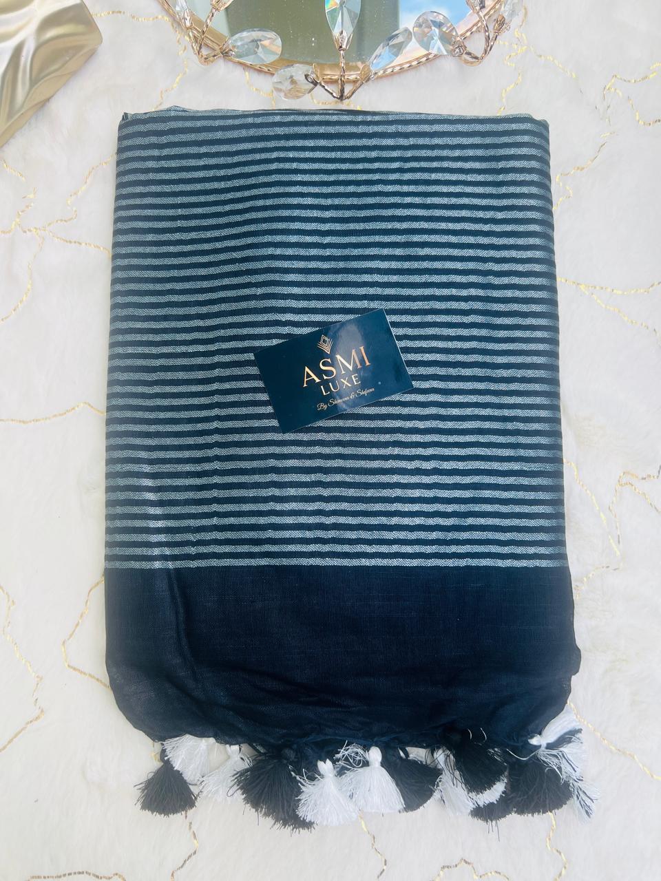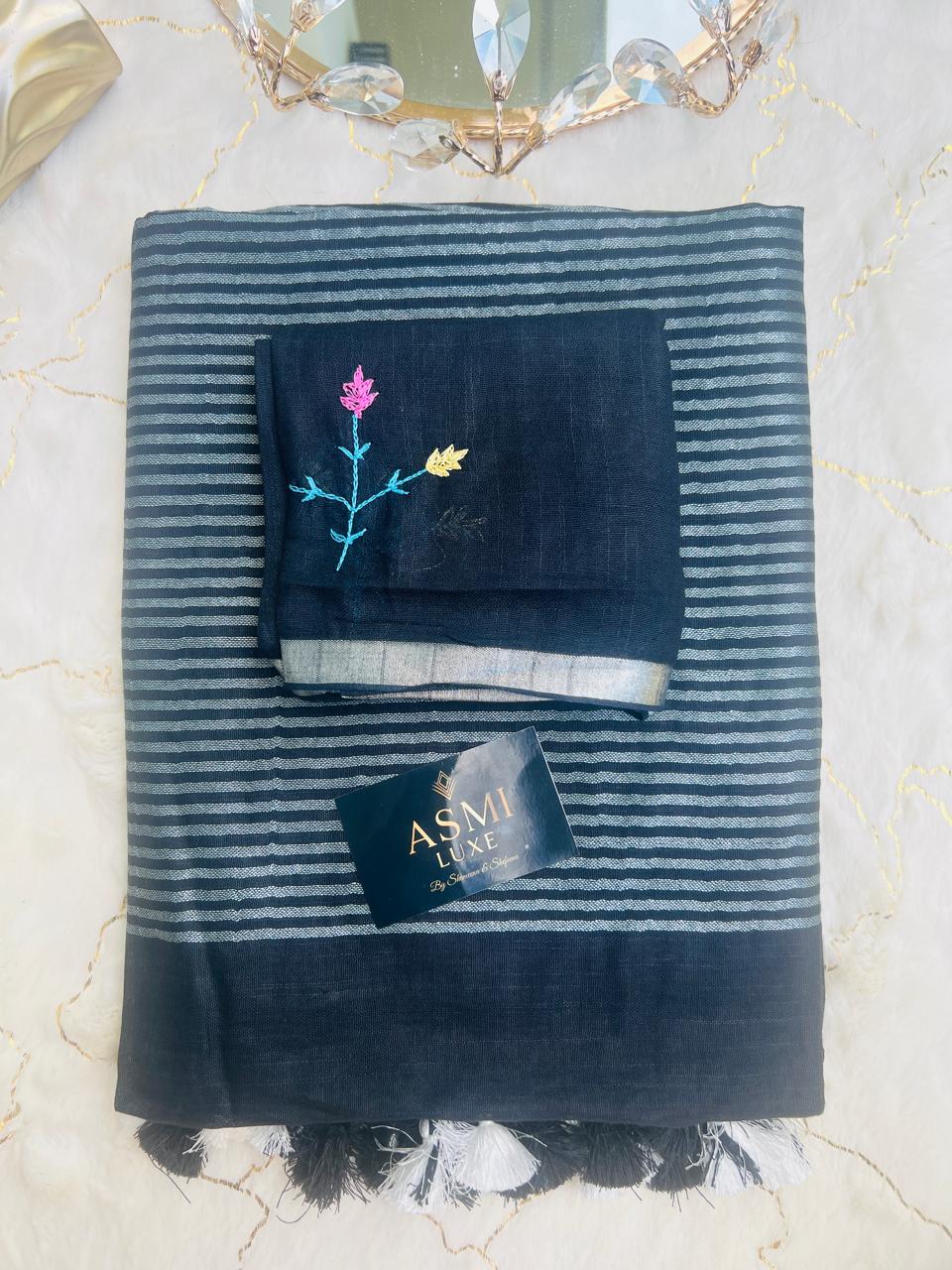 The Black fabric provides a stunning backdrop for the intricate and colorful butterfly embroidery on the pallu, adding a touch of whimsy to this classic piece. This Light weight and comfortable linen Thread embroidery sarees is a ideal for party wear and all occasions.