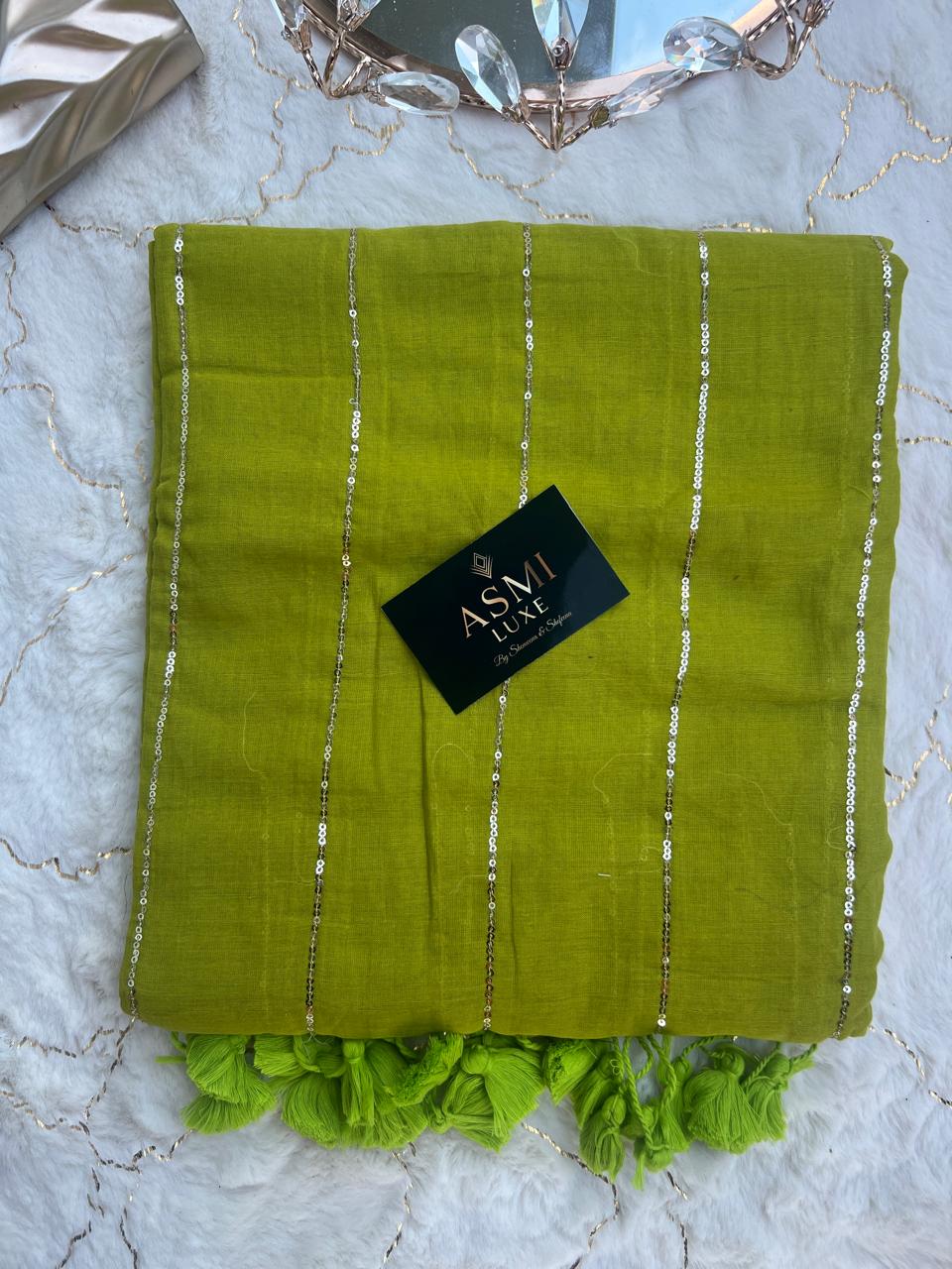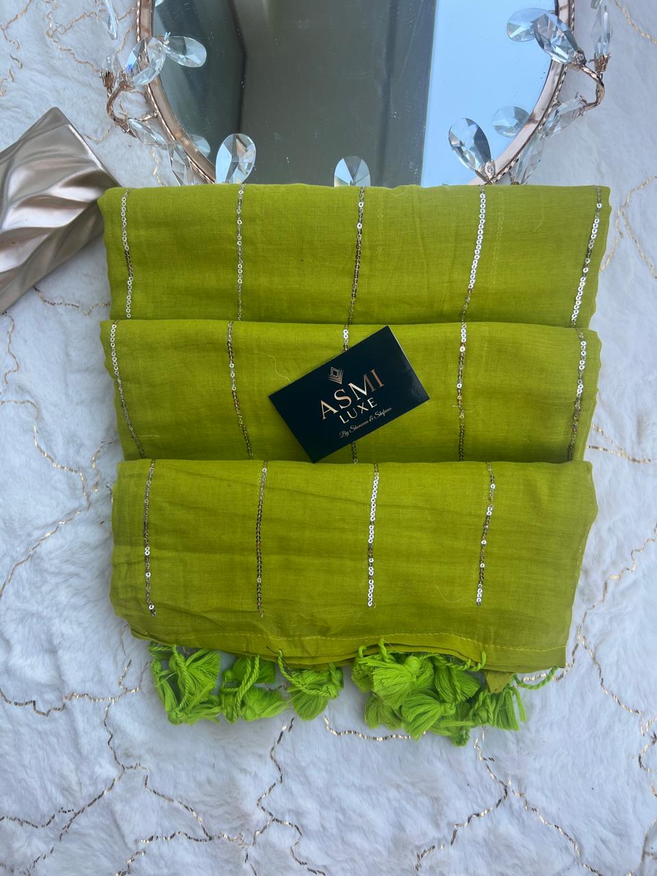 Introducing the stunning Mulmul Cotton Zari Work Saree, made from a luxurious mulcotton blend and embellished with sequins. Perfect for festive celebrations or elegant parties, it combines comfort and style. With its versatile design, the Mulcotton Zari work Saree blends traditional charm with modern flair, ensuring you stand out on any occasions.