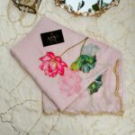 This Floral printed Soft Organza saree blends classic beauty with modern elegance. This beautiful piece with printed lotus motifs highlighted through cut-dana, sitara, pearls and Zari along with a beautiful and delicate scallop hand-embroidery border.
